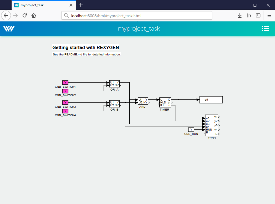 WebWatch is automatically generated HMI based on the project structure. It is similar to the Watch mode in REXYGEN Studio. The whole scheme is generated to web page. User can monitor all signals from selected blocks, change block parameters and read the data from TRND blocks. The WebWatch is generated automatically using HMI block in project main file.