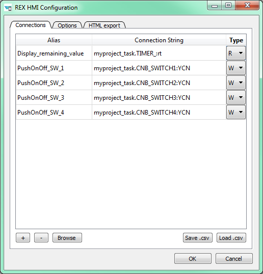 Open the HMI Configuration dialog either using Extensions REXYGEN HMI Edit HMI Config or just unselect all components in the drawing (click outside any component) and press Ctrl+E. The configurator parses all components and creates a list of used Aliases. Each of them should be linked with one signal in the running algorithm. You can either fill in each connection string manually or you can use the Browse function.