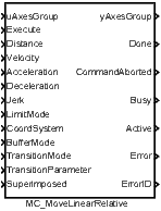 Blok MC_MoveLinearAbsolute slouží pro přesun koncového efektoru po přímce na zadanou pozici. Pozice se zadává relativně od aktuální polohy v souřadném systému zvoleném vstupem CoordSystem. Parametry Velocity, Acceleration, Deceleration a Jerk určují rychlost, zrychlení, zpomalení a změnu zrychlení ve směru pohybu (tj. tečně k trajektoriji). Pro určení těchto parametrů se vychází při použití souřadného systému MCS nebo PCS jen z polohových souřadnic. Další souřadnice (úhel natočení) se již generují proporcionálně, tak aby byl pohyb v těchto souřadnicích lineární a skončil ve stejném okamžiku jako polohové souřadnice. Pokud se poloha nemění (dochází tedy jen k otočení koncového efektoru), počítá se rychlost/zrychlení ze všech souřadnic, ale číslo má pak jiný fyzikální význam. Cílovou polohu určuje vektorový parametr Distance. Tento parametr musí mít tolik prvků, kolik předpokládá kinematická transformace (viz MC_SetKinTransform_Lin). V opačném případě je signalizována chyba a pohyb se neprovede. Pohyb je spuštěn náběžnou hranou na vstupu Execute.
