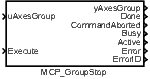 Blok MC_GroupStop zastaví pohyb. Režim je vždy aborted, tj. zastavování se spouští okamžitě. Blok se nejprve pokusí zastavit ve směru původní trajektorie. Pokud se to nepodaří, zastaví se pomocí errorstop sekvence na jednotlivých osách již nekoordinovaně. Dokud je na vstup Execute hodnota true nebo dokud se skupina pohybuje, nachází se skupina ve stavu „Stopping“ a není možné spouštět další bloky. Okamžitě po zastavení se nastaví na výstupu Done hodnota true (pokud nenastane chyba). Skupina os přejde do „Standby“ až po deaktivování vstupu Execute.
