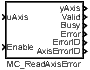 Blok MC_ReadAxisError zpřístupňuje na výstupu AxisErrorID aktuální chybový kód připojené osy. Pokud osa není ve stavu chyby, hodnota tohoto výstupu je 0. Hodnota je platná jen pokud je výstup Valid nenulový, čehož se dosáhne nastavením vstupu Enable na nenulovou hodnotu.