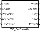 Blok MC_SetOverride nastavuje násobivé faktory které se projeví ve všech blocích pracujících s osou. Hodnoty rychlosti, zrychlení a jerku ve všech blocích je potřeba vynásobit faktorem z tohoto bloku, abychom dostali hodnotu, se kterou blok skutečně pracuje. Toto se netýká limitních hodnot zadaných v RM_Axis a administrativních bloků.
