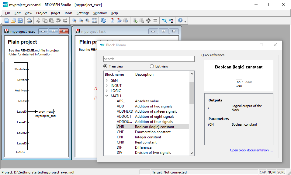 REXYGEN Studio is a developer’s tool which runs on a standard PC with Windows. You create the algorithms using the function block library (The IEC 61131-3 standard defines Function Block Diagram (FBD) as one of the PLC programming techniques.) of the REXYGEN system [1]. The library contains simple comparators and timers as well as advanced blocks for signal processing and feedback control (PID controllers etc.). You compile your project on your PC and run it on your Raspberry Pi.