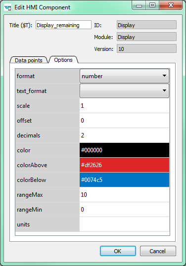 For configuration of the display settings select the display by mouse click on top of it and use the Edit Component extension from Extensions REXYGEN HMI Edit Component (Ctrl+E). When the configuration dialog is opened you can change the Title to Display_remaining. The Edit Component dialog has two tabs: Data points and Options.