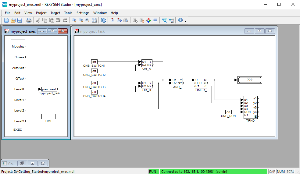 The RexCore (REXYGEN runtime core) service runs on the target device (Raspberry Pi). Once installed, it runs in the background and therefore it is almost invisible for the user. It handles timing and execution of your algorithms and provides various services. The individual tasks are prioritized and executed using preemptive multitasking. The RexCore service is automatically started at system startup.